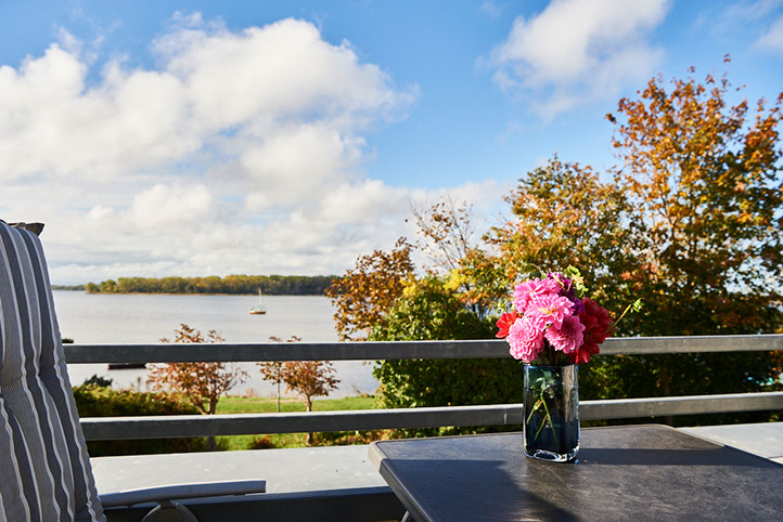 Vom Wohnbereich und vom großzügigen Balkon aus können Sie das Salzhaff bis zur Halbinsel Wustrow überblicken, Fischer- und Segelboote, Tiere und den Sonnenuntergang beobachten.